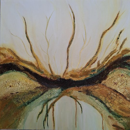 Het thema voor de expositie in De Grote kerk Driebergen was "Spreid uw dragende vleugels over ons uit, spreid uw warme lichtglans over ons uit." Dit heb ik op een abstracte manier verbeeld: in allerlei moeiten kan je soms kleine aanrakingen voelen van liefde warmte en licht.
